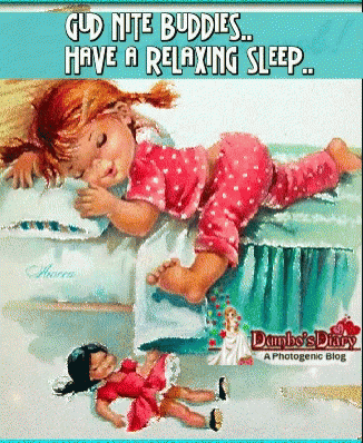 A heartwarming illustration of a child sleeping soundly in bed with a doll, wishing good night to buddies.