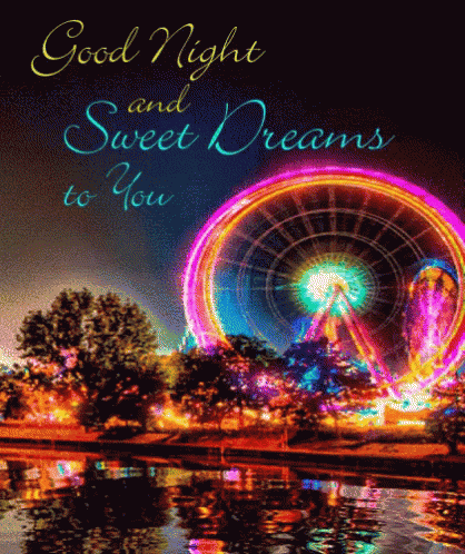 Vibrant Ferris wheel illuminated at night, reflecting on water, with a 'Good Night and Sweet Dreams' message.