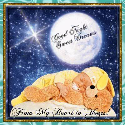 A baby sleeps peacefully on a teddy bear under a starry night sky with a full moon, wishing 'Good Night Sweet Dreams'.