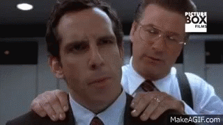 Alec Baldwin gives Ben Stiller a shoulder massage in a scene from a film, with Ben Stiller looking uncomfortable.