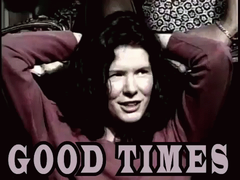 Edie Brickell smiles with her hands behind her head, with the text 'GOOD TIMES' overlaid.