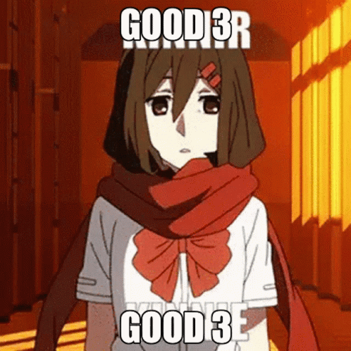 Anime girl with a red scarf and bow stands in a hallway, displaying 'GOOD 3R GOOD 3E' text.