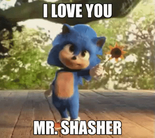 Baby Sonic holds a sunflower and expresses affection with the message 'I Love You Mr. Shasher'.