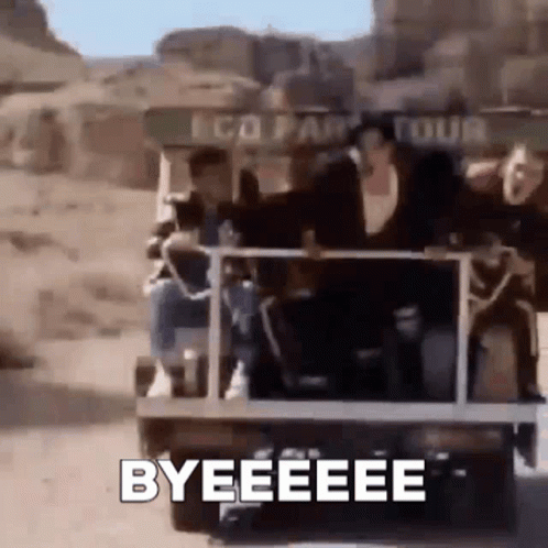 Dimash Kudaibergen and friends wave goodbye from an eco-tour vehicle in the desert.