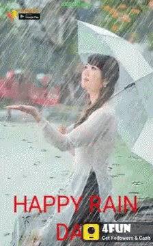 A woman enjoys a rainy day, holding an umbrella and looking up at the falling rain.