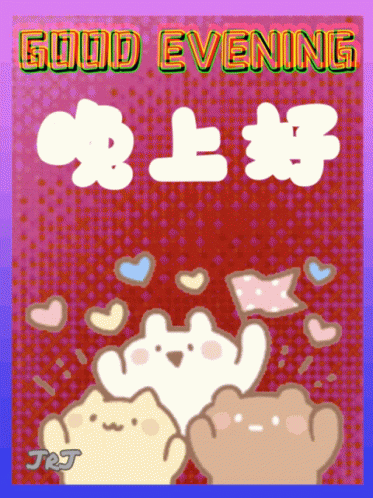 A vibrant 'Good Evening' (晚上好) greeting card featuring cute animated bears and cats with hearts.