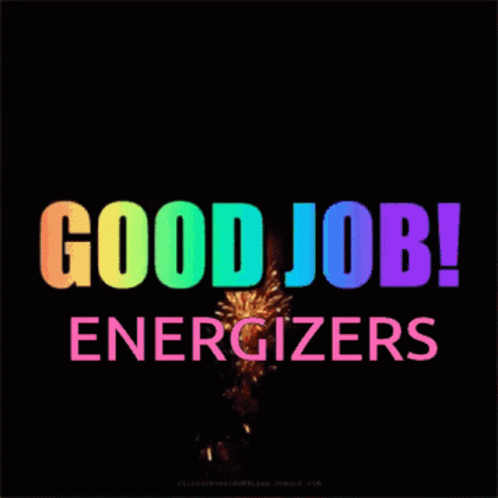 A vibrant fireworks display illuminates the night sky with the encouraging message 'GOOD JOB! ENERGIZERS' in colorful text.