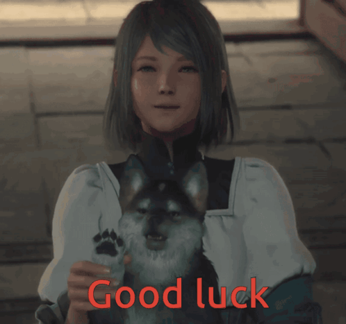 Jill Warrick from Final Fantasy XVI holds a cute dog, with 'Good luck' text overlaid on the scene.