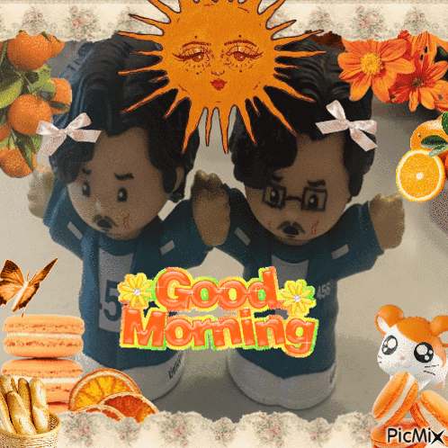 Squid Game's Sangwoo and Gihun dolls wish you a good morning amidst a vibrant collage of oranges and flowers.