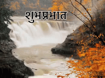 A beautiful waterfall surrounded by autumn trees, with a 'Good Morning' message in Hindi.