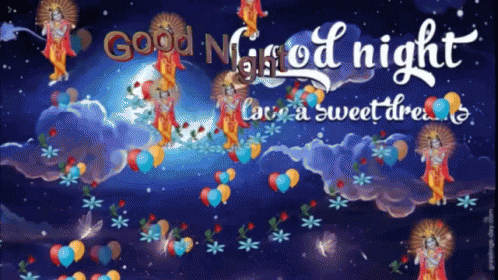 Animated good night greeting featuring floating balloons, flowers, clouds, and Hindu deities for sweet dreams.