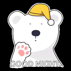 A cute polar bear cartoon wearing a yellow sleeping cap waves its paw and says good night.