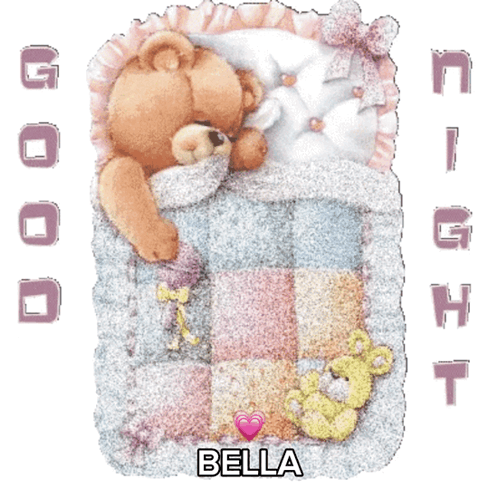 A cute teddy bear sleeping soundly in bed with a patchwork blanket, wishing 'Good Night Bella'.
