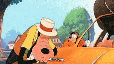 Goofy expresses feeling 'all alone' while standing by an orange car, looking dejected.