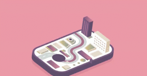 Isometric animation of a city plan on a smartphone, featuring navigation, buildings, and a small person.