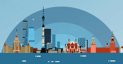 Animated city skyline with a rocket flying across the blue sky, featuring iconic Russian architecture.