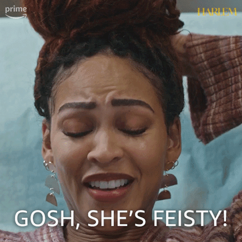 Camille Parks reacts with "Gosh, she's feisty!" while adjusting her hair in a bun.