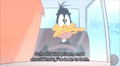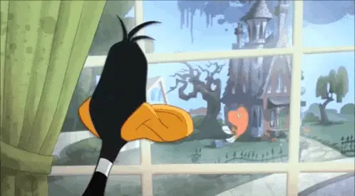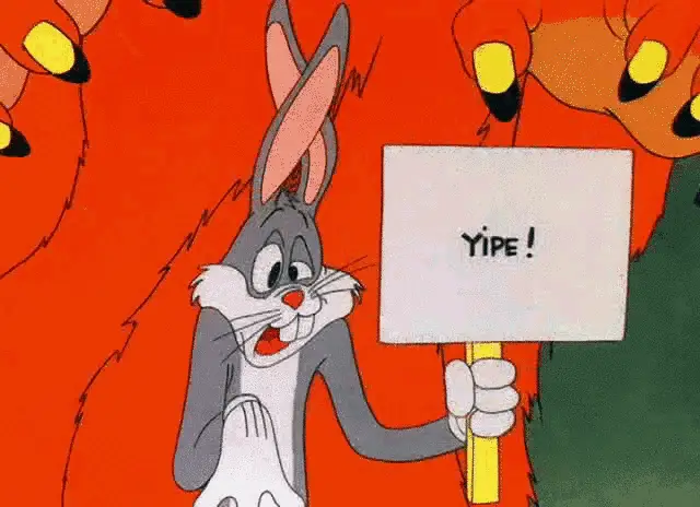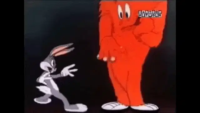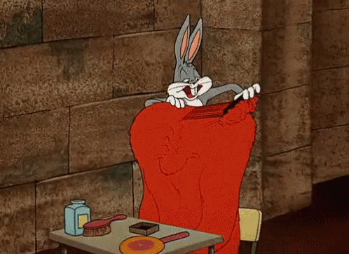 Bugs Bunny happily grooms Gossamer's red fur with a brush in a classic Looney Tunes cartoon scene.