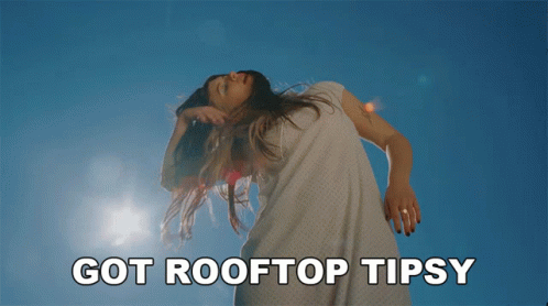 Gatlin dances on a rooftop, feeling tipsy and happy, with 'Got Rooftop Tipsy' text overlay.