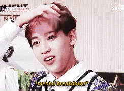 A Got7 member appears flustered in front of the camera, humorously captioned as a 'mental breakdown'.