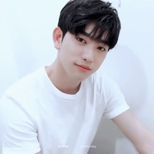 Got7's Park Jin-young (Jinyoung) looks directly at the camera with a warm smile, wearing a white t-shirt.