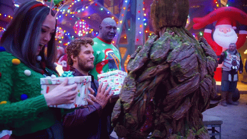 Mantis, Peter Quill, Drax, and Groot celebrate the holidays, exchanging gifts and sharing hugs in a festive scene.