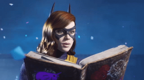 Batgirl, also known as Barbara Gordon, from Gotham Knights, is engrossed in reading a large book.