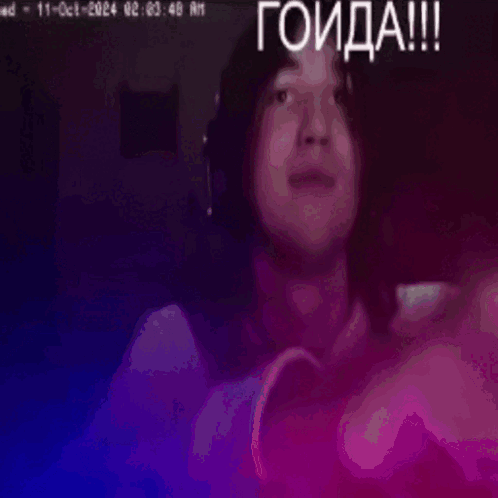 Leonid screaming 'Goyda!' in a dark, blurry room, captured on camera with a timestamp of 11-Oct-2024.