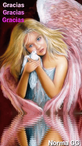 A digital painting of an angel with pink wings holding a white dove, with 'Gracias Gracias Gracias' text.