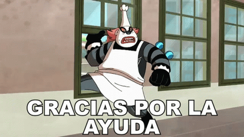 Ben10 character in a chef's hat, exclaiming 'Thanks for the help' in Spanish.