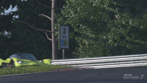 The Aston Martin Valkyrie hypercar races on a track in the video game Gran Turismo 7.