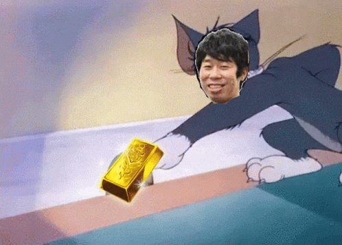 KMR's face on Tom from Tom and Jerry, reaching for a Gold Bar, a meme related to Granblue Fantasy (GBF).