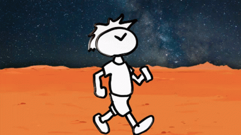 Grancoso Marca, a stick figure with a clock head, walks through a desert landscape with a waving cactus.