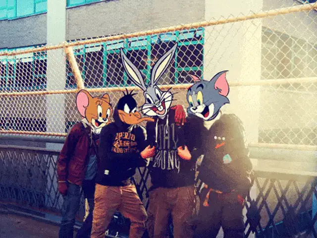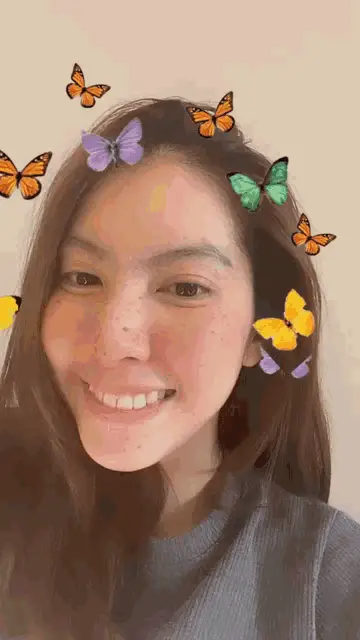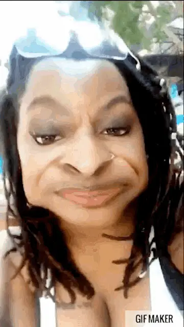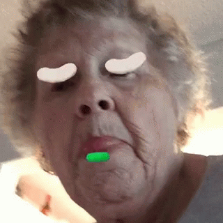 Elderly woman with a funny face filter, showing exaggerated crying eyes and a green, sad mouth.