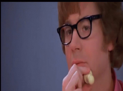 Mike Myers in character, holding a small yellow object near his mouth, resembling a 'grano'.