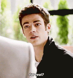 Grant Gustin as Barry Allen from The Flash asks 'For real?' with a questioning expression.