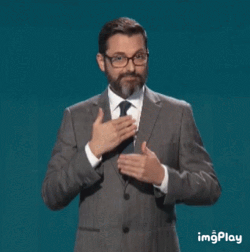 A man in a suit and tie expresses gratitude by signing 'Grazie Thanks' in sign language.
