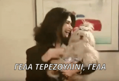 Vana holds Terezoulini, a small white dog, on Greek TV, telling it to laugh.