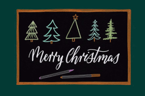 A festive blackboard features hand-drawn green Christmas trees and the greeting 'Merry Christmas'.