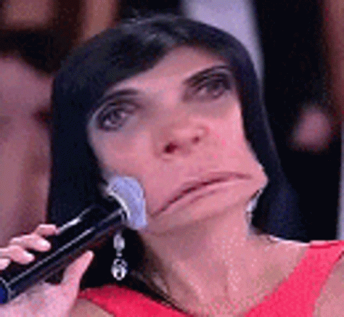 Gretchen Afonsinha making a funny, distorted face while holding a microphone to her cheek.