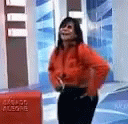 Gretchen Pandlr dancing energetically in an orange shirt in front of a 'Grupo Alegre' sign.