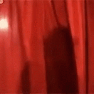 Gretchen performs a reverse reveal from behind a vibrant red curtain, wearing a light-colored outfit.