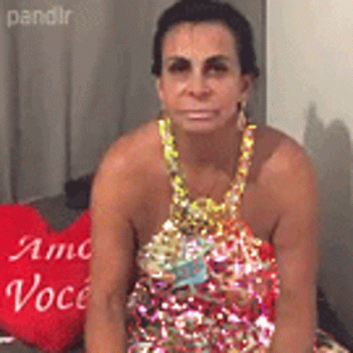 Gretuxca in a sparkling dress sitting on a couch next to a pillow that says 'amo vocĂȘ'.