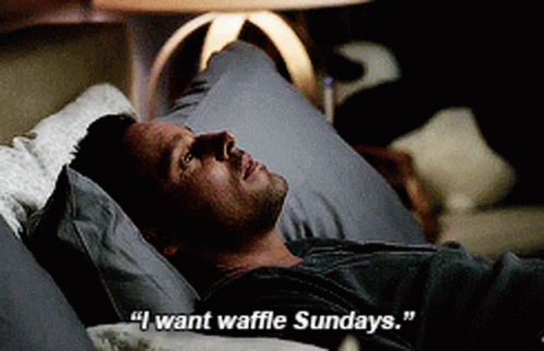 Alex Karev from Grey's Anatomy, played by Justin Chambers, lies in bed saying, 'I want waffle Sundays.'