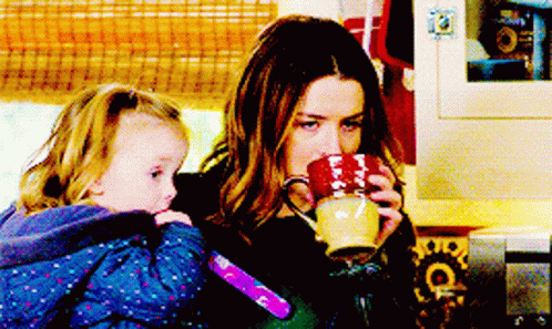 Amelia Shepherd (Caterina Scorsone) sips coffee from a mug while holding a child brushing their teeth in Greys Anatomy.