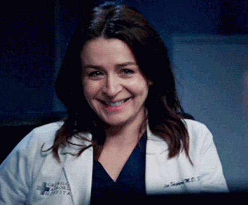 Amelia Shepherd, portrayed by Caterina Scorsone, smiles and chuckles in a scene from Grey's Anatomy.