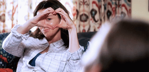 Amelia Shepherd from Grey's Anatomy making a heart shape with her hands, wearing a plaid shirt.