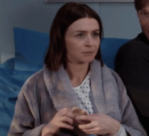 Amelia Shepherd (Caterina Scorsone) from Grey's Anatomy smiles while opening a package of graham crackers.