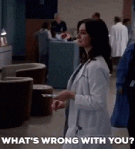 Amelia Shepherd from Grey's Anatomy in a hospital, holding a scalpel and asking 'What's wrong with you?'