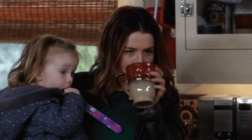 Amelia Shepherd, played by Caterina Scorsone, enjoys her morning coffee while holding a little girl.